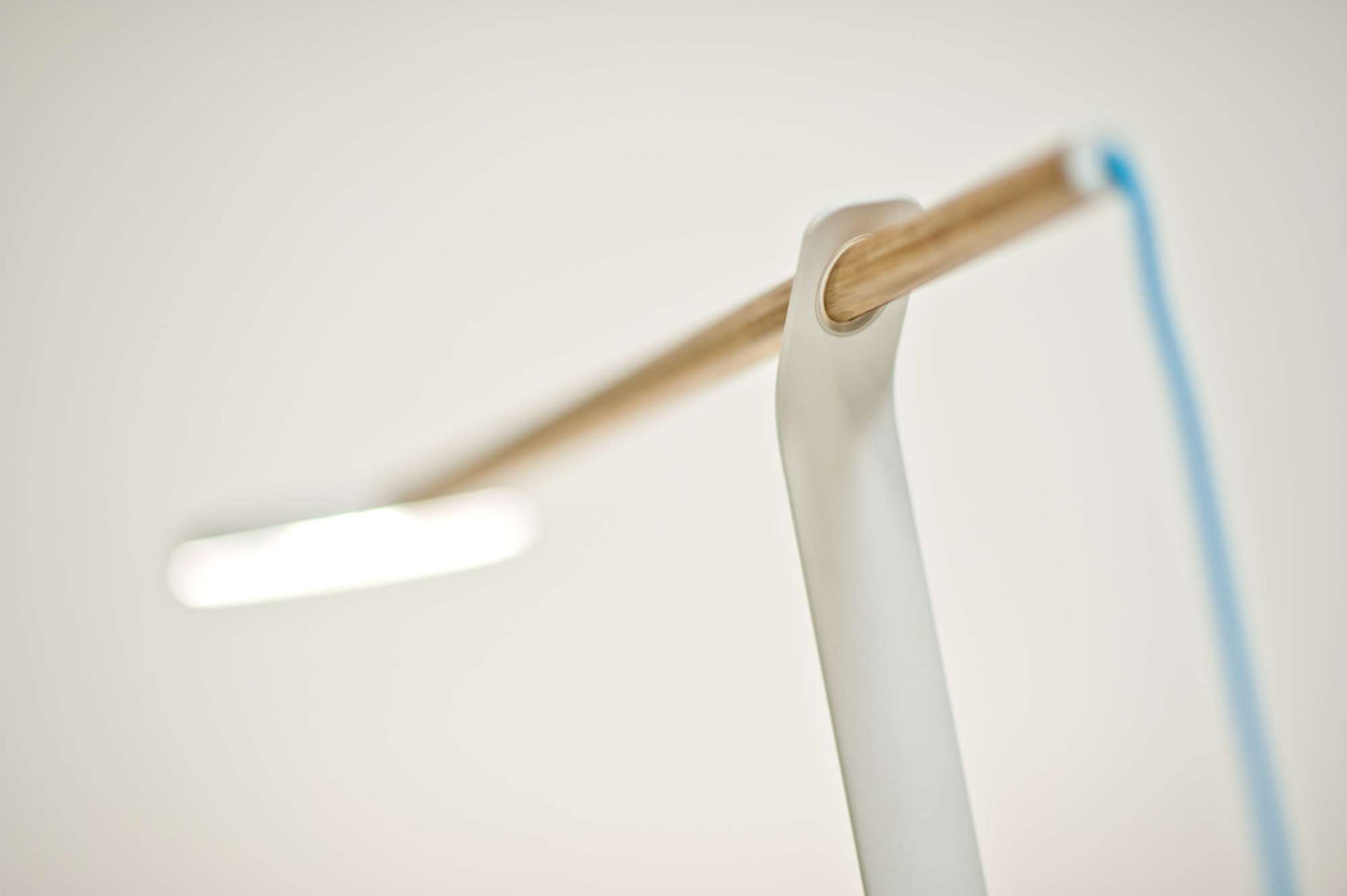 Gravy LED desk light by Kocept - White Oak/White with a blue cord