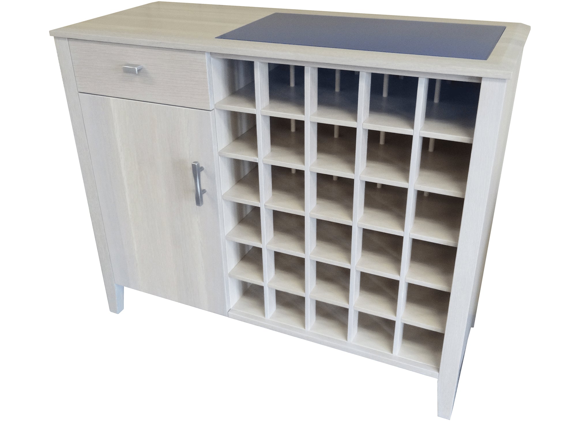 Designed for a smaller space, this beauty will hold up to 30 wine bottles. A handy drawer holds your openers whether it's a trusty corkscrew, your book of tasting notes and any other paraphernalia: there's plenty of space. An adjustable shelf behind the door allows for storage of wine glasses, or your hard liquors and a shaker. Cheers!